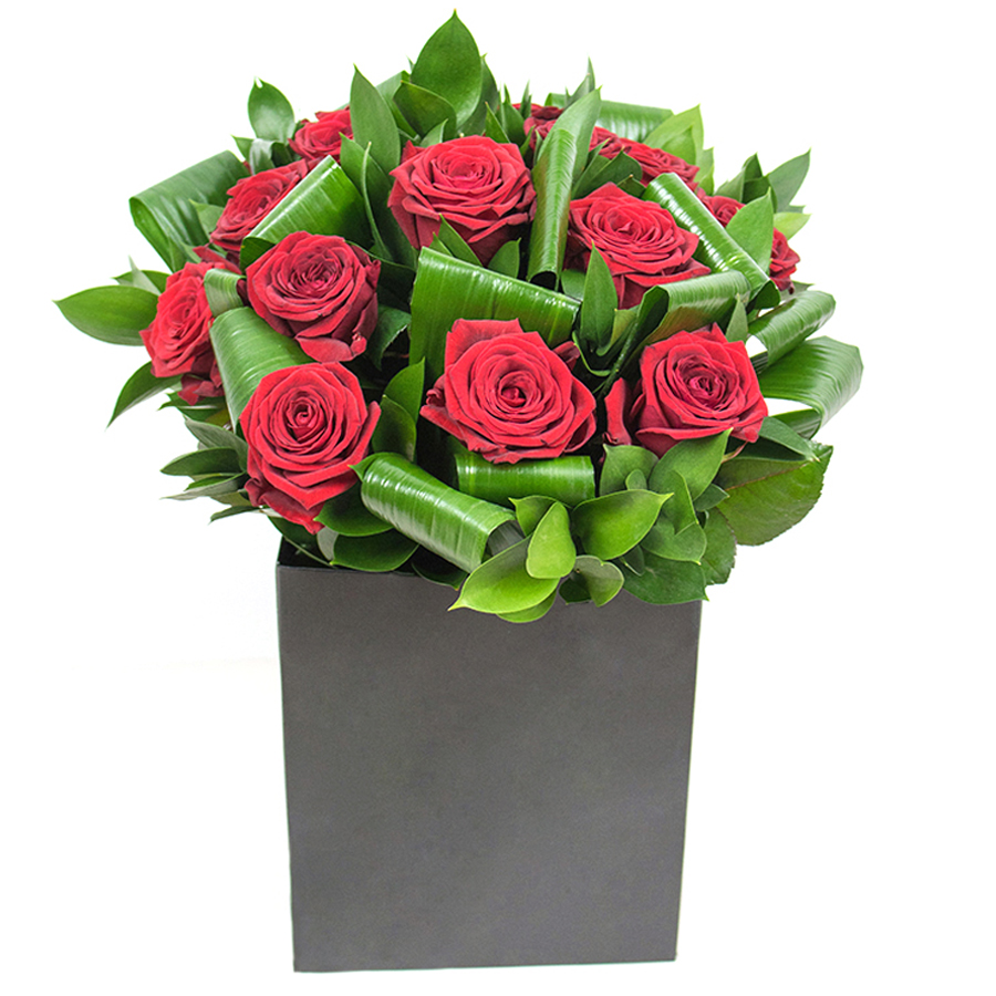 Our refined red rose bouquet showcases the timeless beauty of red roses, paired with elegant aspidistra leaves and ruscus. This unique arrangement adds a touch of sophistication and style to any home or special occasion.