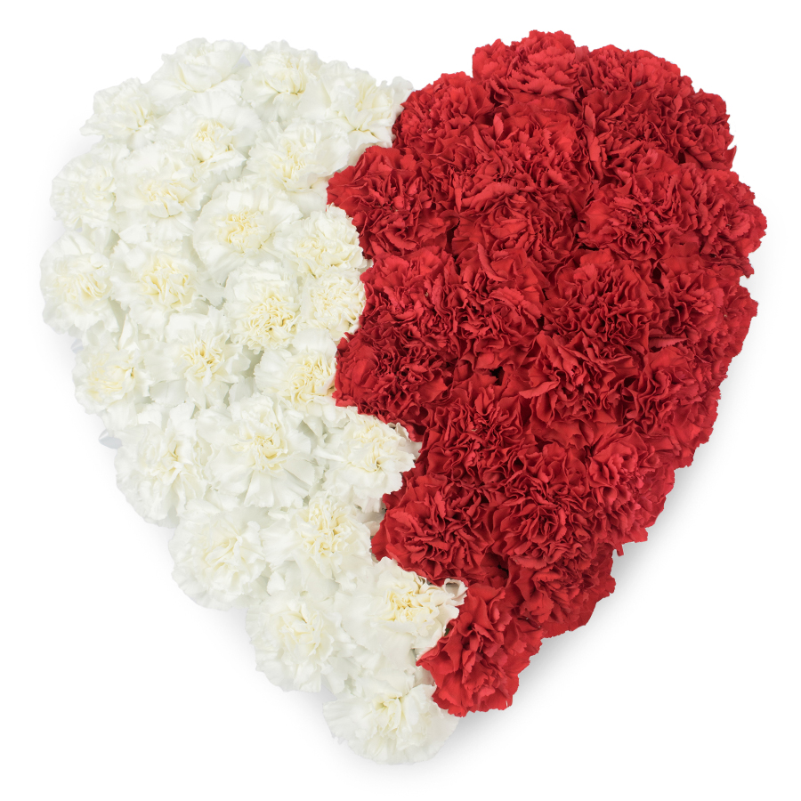 Express your love and sympathy with our romantic heart-shaped arrangement, featuring beautiful white and red carnations. Each flower is carefully hand-selected for its freshness and vibrant color, ensuring a luxurious and lasting display.